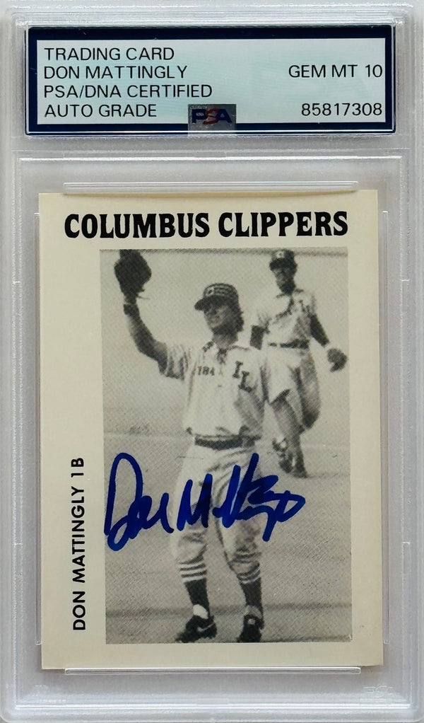Don Mattingly Autographed 1984 Columbus Clippers Promo Card. Card is signed in blue sharpie across the front of the card. Card is authenticated and slabbed by PSA.