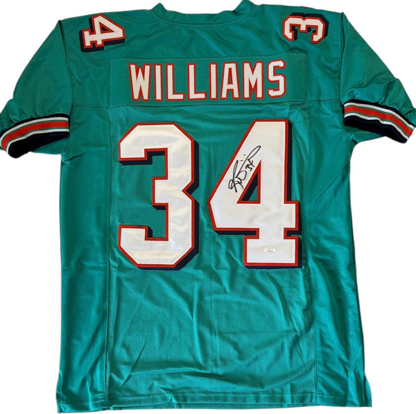 Ricky Williams Autographed Custom Miami Dolphins Jersey. Signed in black sharpie on the jersey number on the back of the jersey . This autographed jersey has a JSA Witness Hologram #WPP37511 but will also come with a COA from Hollywood Collectibles.