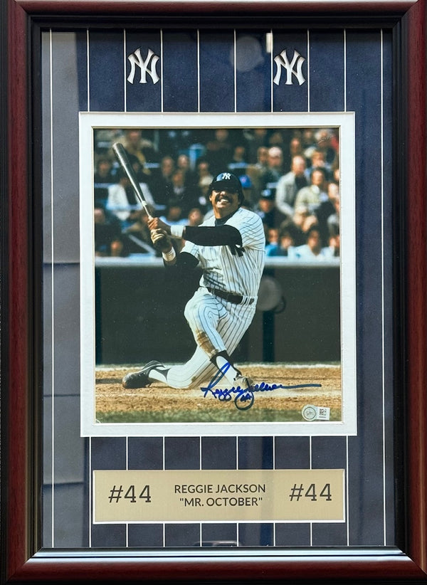 Reggie Jackson Autographed Yankees 8x10 Framed Baseball Photo. Photo is signed in blue sharpie across the front of the photo. This autograph photo comes with a certificate of authenticity from Hollywood Collectibles.
