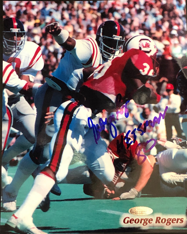 George Rogers Autographed 8x10 Football Photo.  Signed in blue sharpie across the front of the photo with inscription "Heisman 80". This autographed photo comes with a certificate of authenticity from Hollywood Collectibles.
